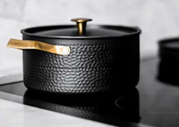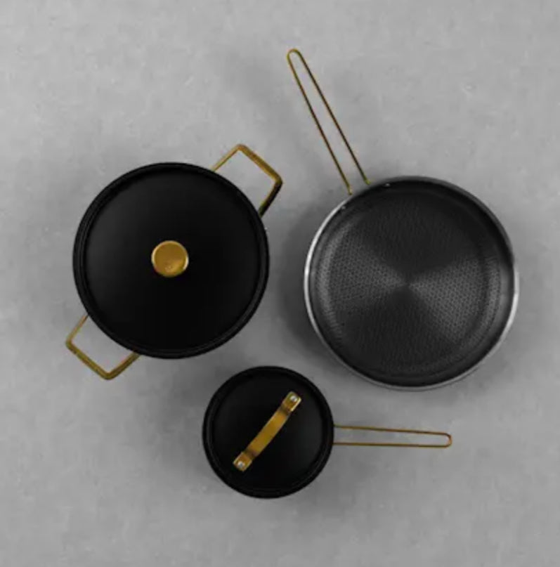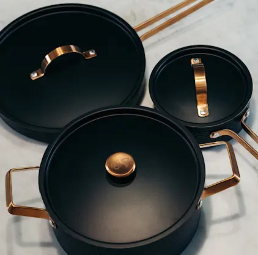 Grytset i 3 delar från Vargen & Thor. 1,6 liter, 4 liter samt traktörpanna 28 cm. Svart stål med mässingsdetaljer. Tål maskindisk.